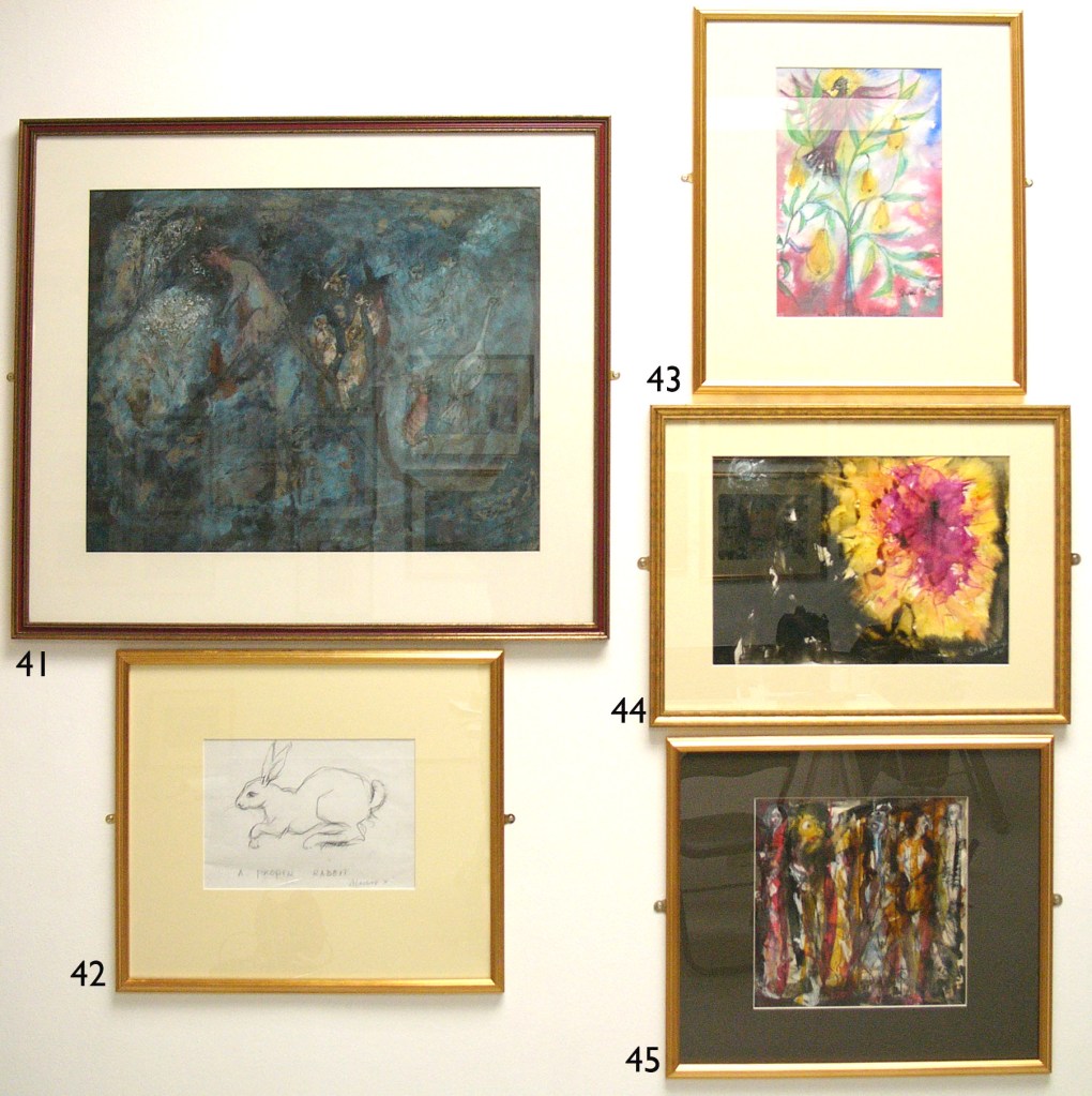 41 Sadie’s Dream 1987 is a mystical design from a dream described to Sax by his sister Sadie Lockwood in their childhood. One of the animals is a rather abstracted rabbit. 42 is a sketch by Maisie of a proper rabbit done during the painting of Sadie’s Dream. It is a rare example of the creative dialogue between Sax and Maisie that was largely confined to dialogue.