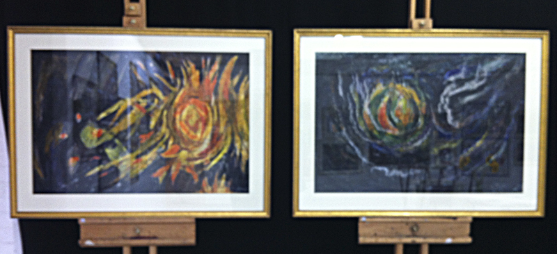These are two of a series of designs loosely titled Red Cathedral. Although retrospectively dated 1956 it is likely that these were later. It is possible that these were speculative designs based on the bombing of Coventry cathedral. Sax became involved with the new cathedral project through his friendship with the architect Basil Spence. Sax produced a small tapestry for the cathedral project however it was not to these cartoons.