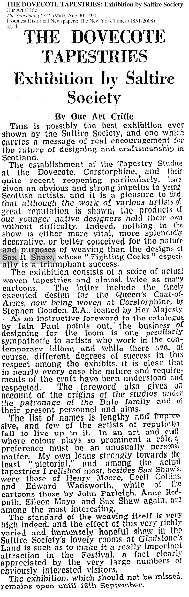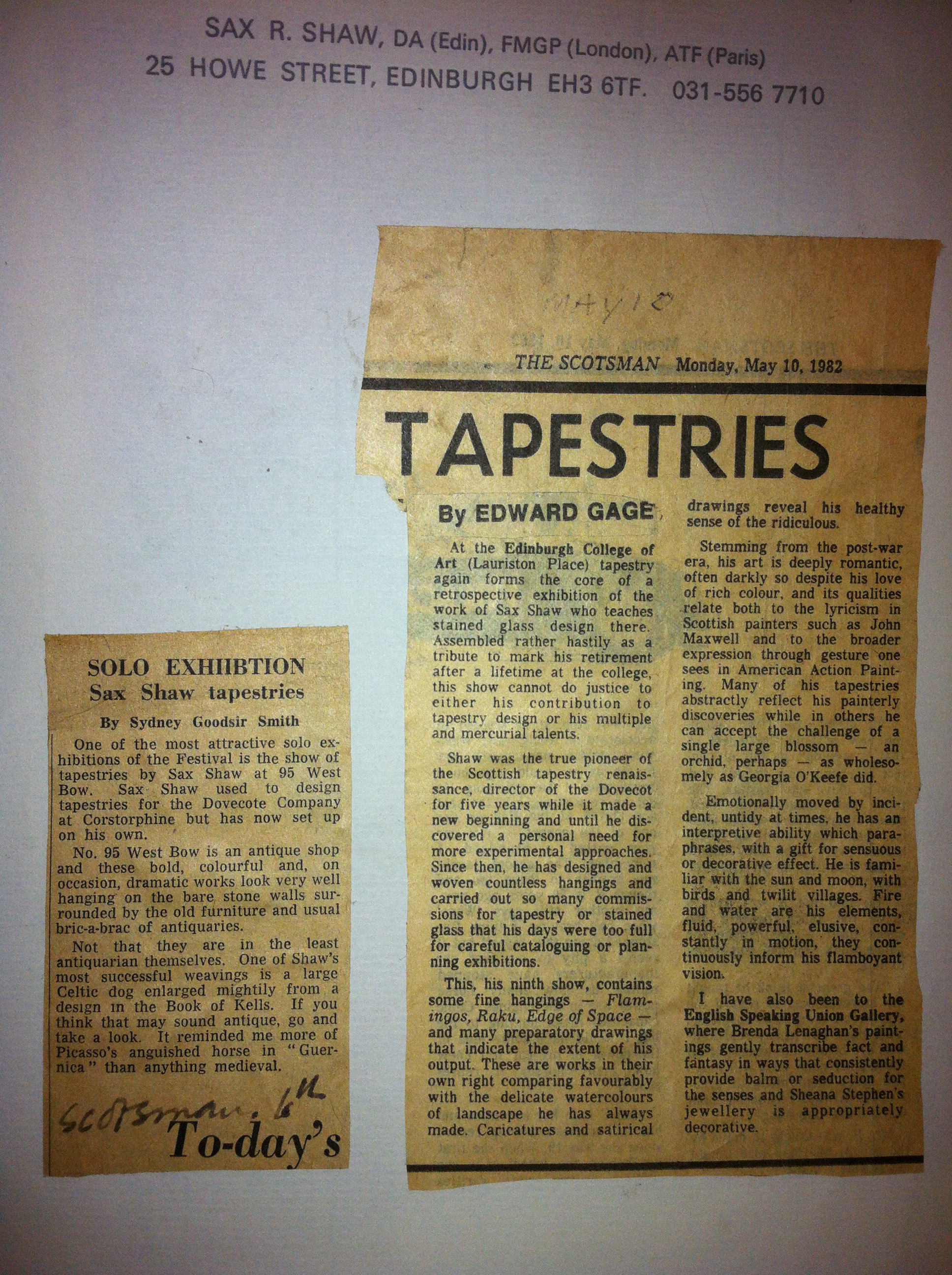My mother, Bette Goettle, has an old, old, old tapestry made by Mr. Shaw. In the 1960s. She would love to contact his son or daughter to tell them how much she still loves this one-of-a-kind piece. We could even send a photo if we find out where to send it. Please contact her at goettle1508@gmail.com when you can. Thank you, Kim Handy (handyabc@gmail.com)